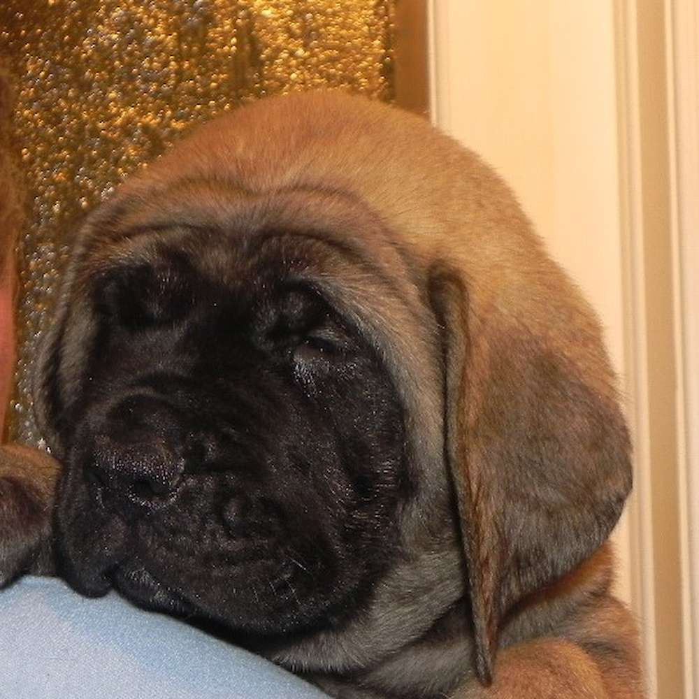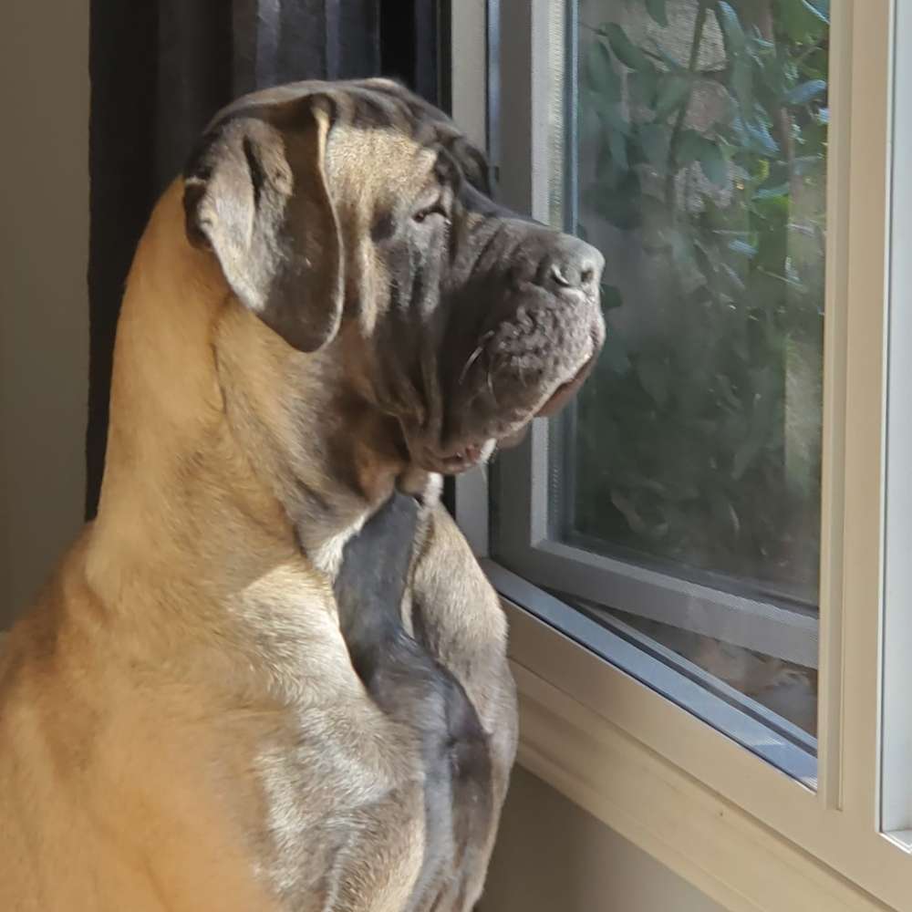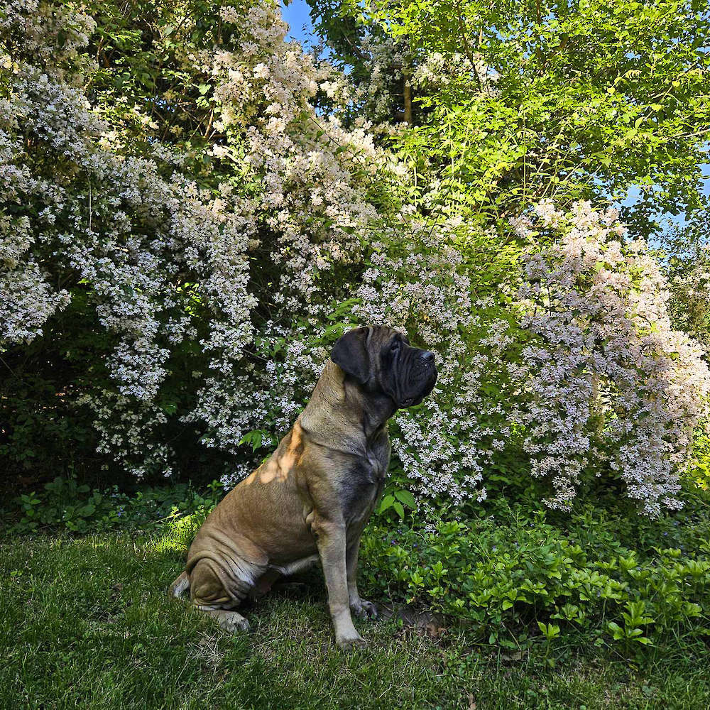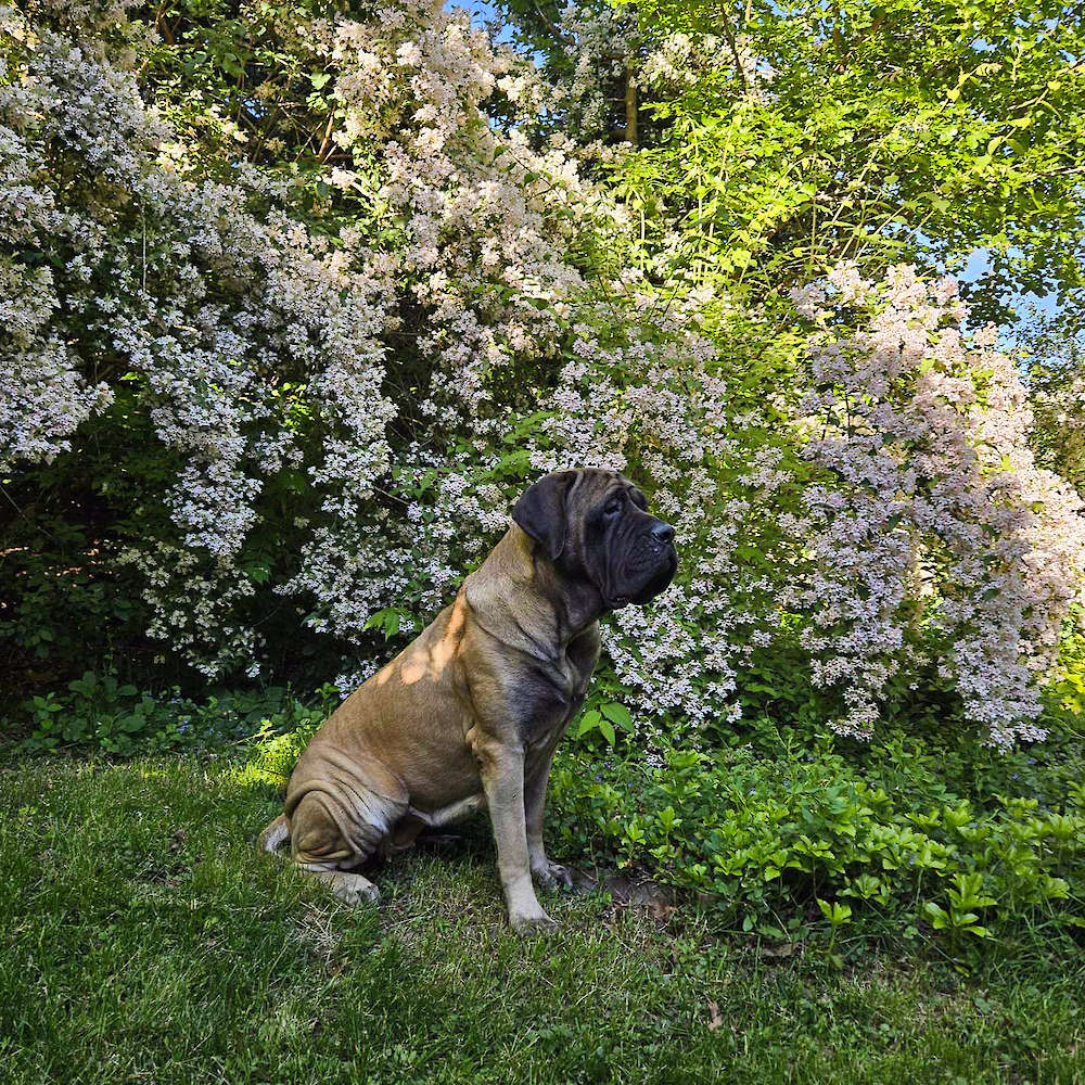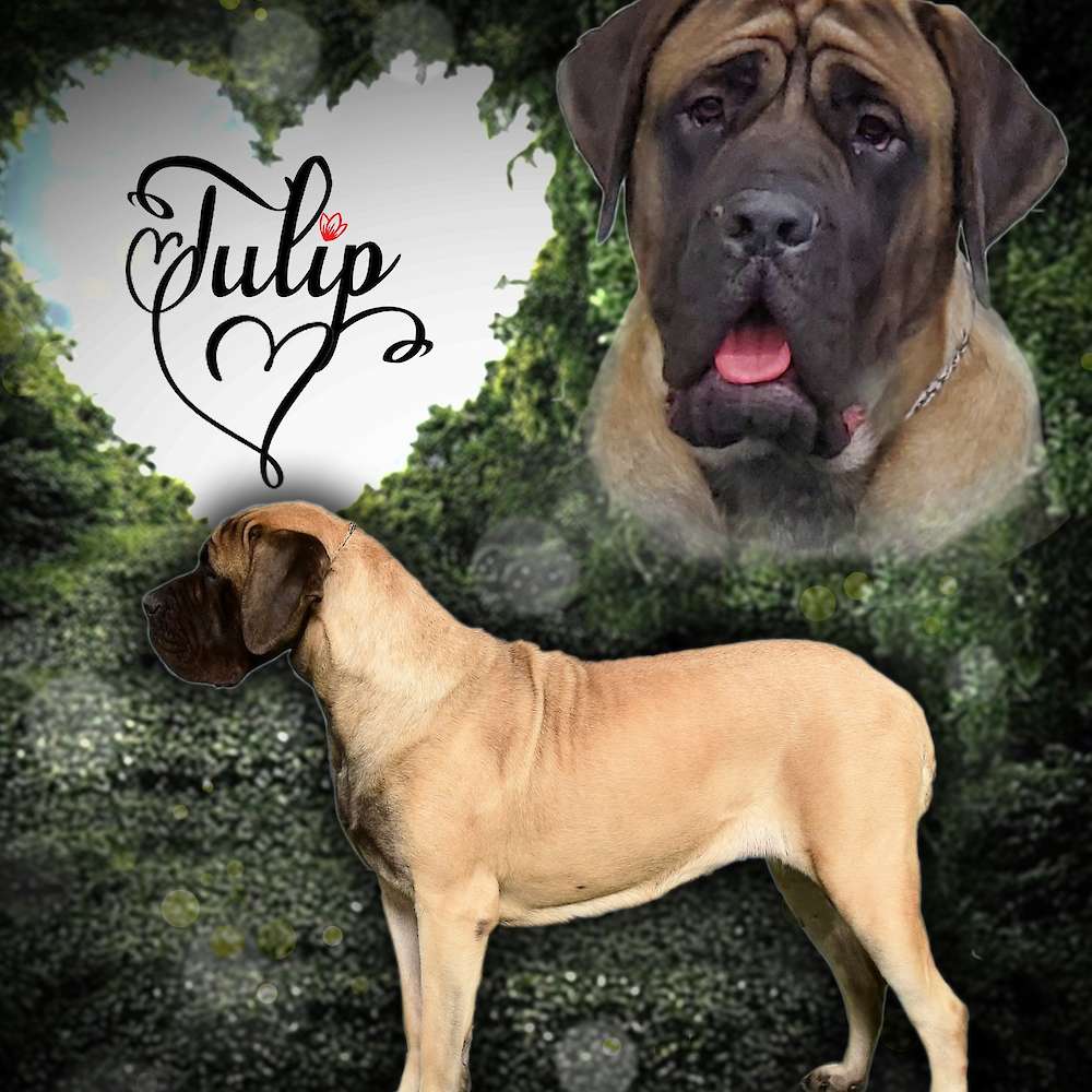 Tulip is sweet and playful with a very mastiff temperament. She loves everyone and everyone loves her. Like all of our dogs, she is happiest when she is with us than when she isn't and she's part of our day to day life. She has cute little quirks, such as pressing her mouth against people's lips to give them dry kisses and her constant war with the squirrels and doves in the backyard.