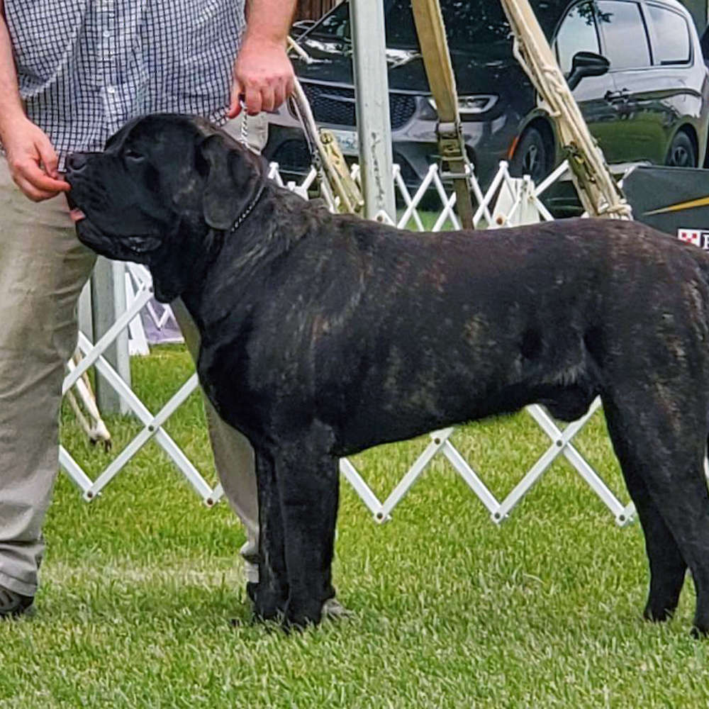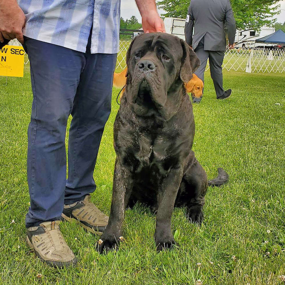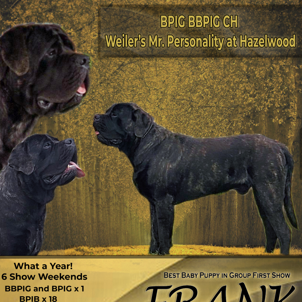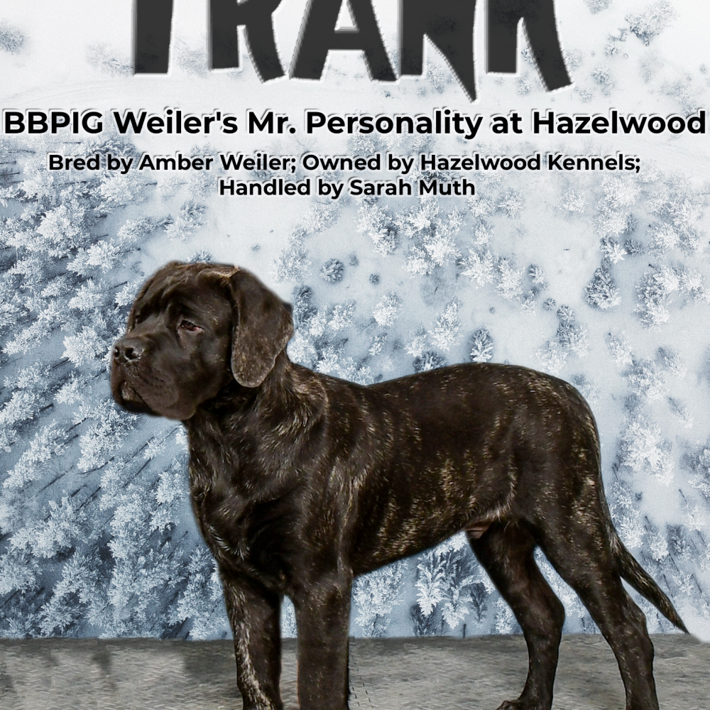 Frank is an amazing dog that has shown the quality and drive that we look for in a Hazelwood Mastiff. In his first six months of showing, he took Best Baby Puppy in Group as well as a Best Puppy in Group. In his first year, he earned Best Puppy in Show, and three Best Puppy in Group. In addition, he placed in group multiple times as an adult dog. And he earned his conformation championship at 11 months, 2 days old!