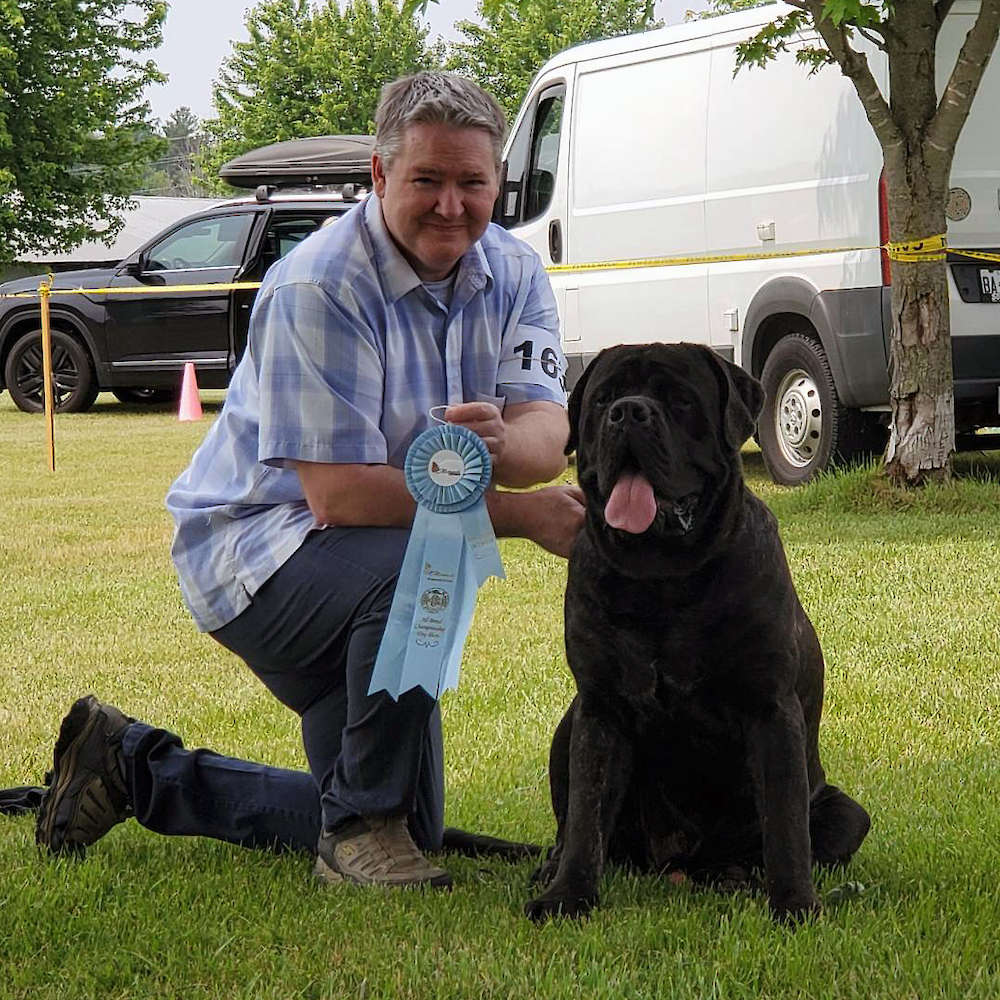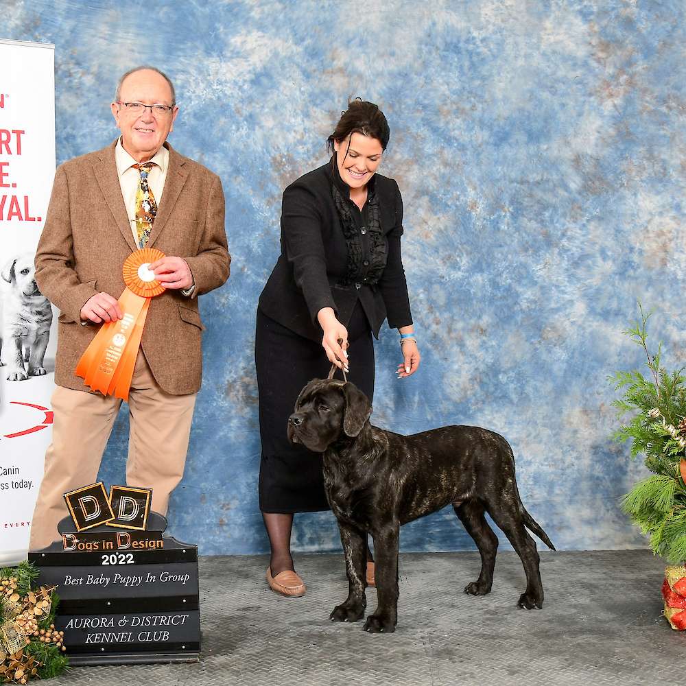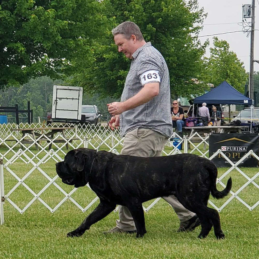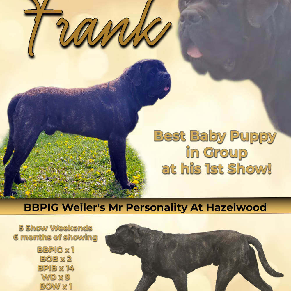 Frank is an amazing dog that has shown the quality and drive that we look for in a Hazelwood Mastiff. In his first six months of showing, he took Best Baby Puppy in Group as well as a Best Puppy in Group. In his first year, he earned Best Puppy in Show, and three Best Puppy in Group. In addition, he placed in group multiple times as an adult dog. And he earned his conformation championship at 11 months, 2 days old!
